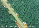 d’œufs sur les jeunes feuilles de moins de 10 mm de long et les larves